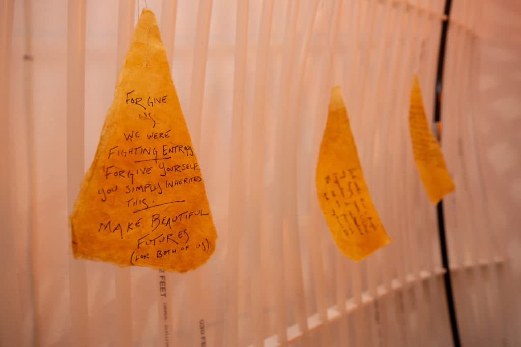 Some pieces translated well as they took on new forms. Grimanis worked closely with artist Freedom Baird to move “Instructions Vault” from its own room within the gallery to the web. Originally offering pieces of Nepalese Lokta paper to write their instructions for possible futures, visitors are now asked to “inscribe” them in a Google form. They are primed with questions asking who will be there, what will be happening, and what will be needed. BCA then posts these instructions on the exhibition page.