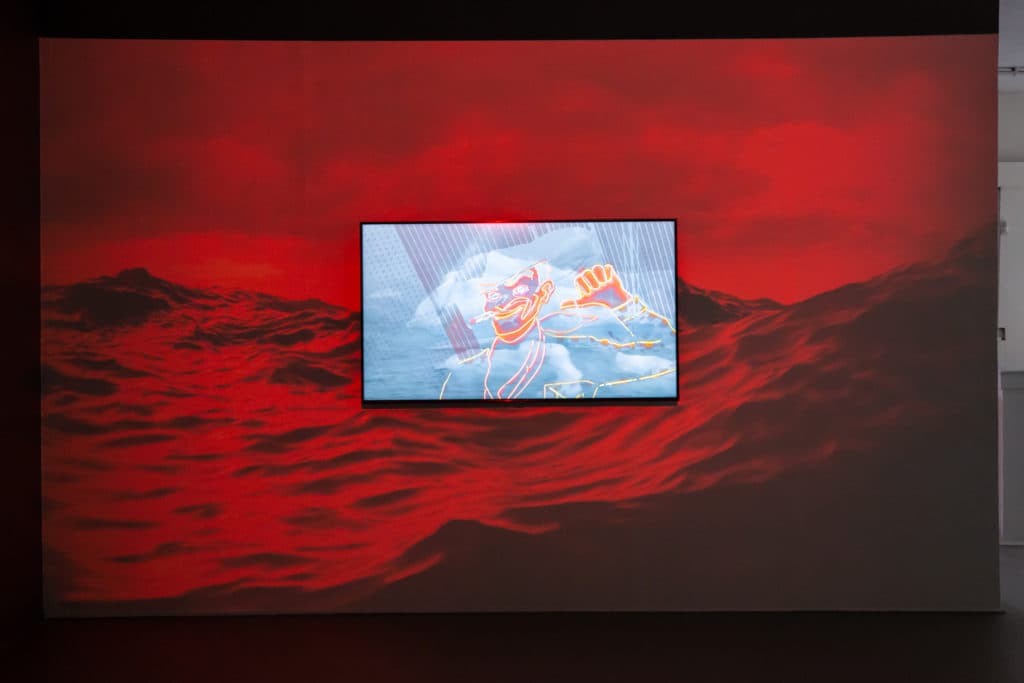 In comparison to “Instruction Vault,” Magda Fernandez’s “Untitled” delivers a stark awakening. Online, we see one video—a series of familiar scenes of Boston superimposed on disaster reels, layered on top of a threatening red ocean. In the gallery, it appeared to take up an entire wall. Fernandez’s work centers on the idea of a disastrous threat of climate change. She seeks to elicit the feeling of dread and fear in order to drive collective action. As the first work we encounter after the online introduction, “Untitled” is a portal into feminist truth-telling. Fernandez believes “feminism is about telling the truth, no matter the resistance,” grounding her work in a very possible future.
