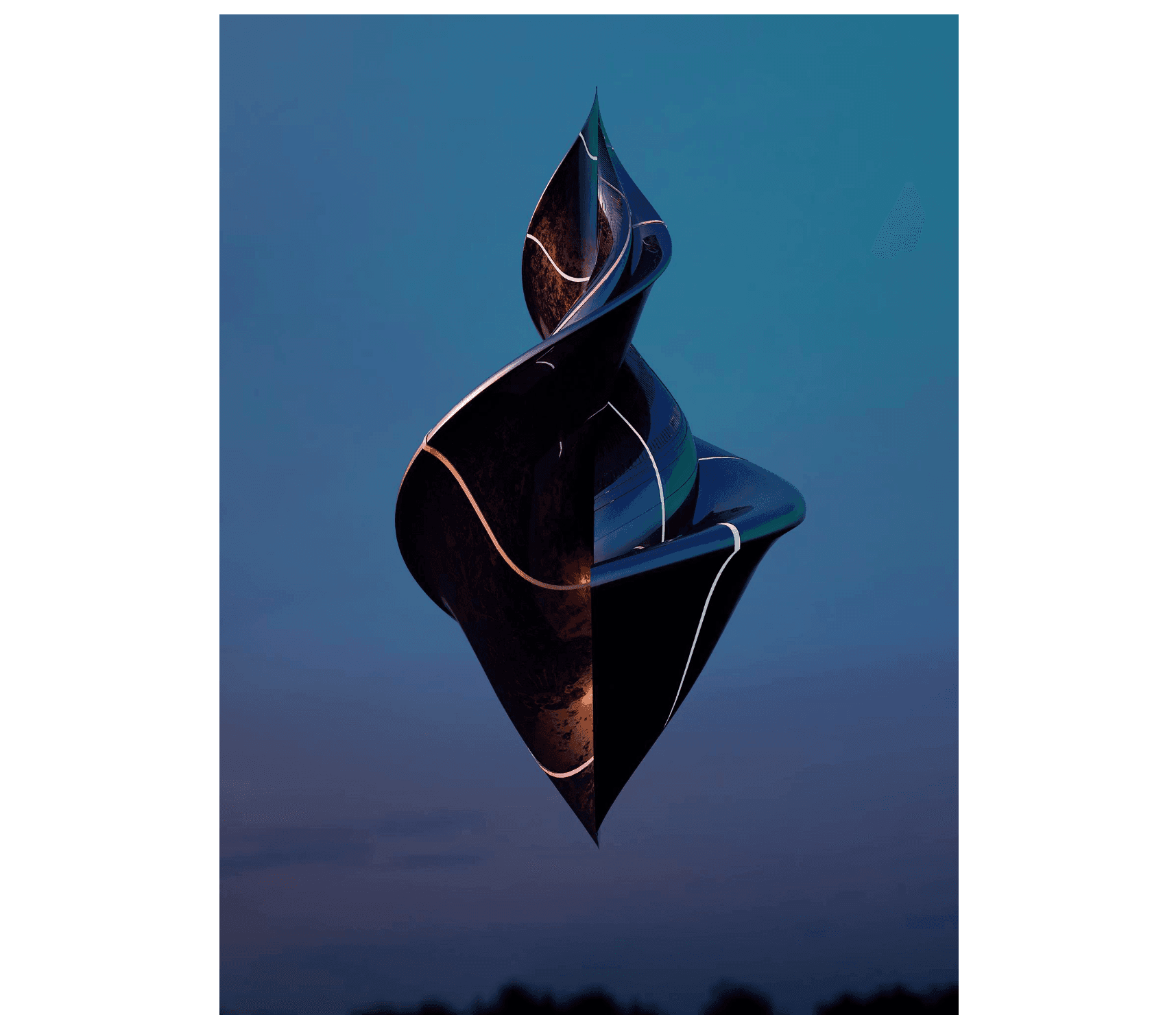 For his first solo museum exhibition in the United States, Saks Afridi lays bare the parafictional premise of his sci-fi Sufism “SpaceMosque” series of works: the average American viewer has few positive perceptions of contemporaneous practices of Islamic mysticism, much less its rich global histories and futures. “SpaceMosque” invites us to move beyond the sting of our provisional knowledge. Here, he is playing with Americans’ decades-long obsession with unidentified flying objects to speculate the possibility of airborne, atemporal prayer vessels through glossy aluminum prints and sculpted artifacts. Seeing might not yet be believing, but Afridi and his many collaborators certainly make the act plausible.