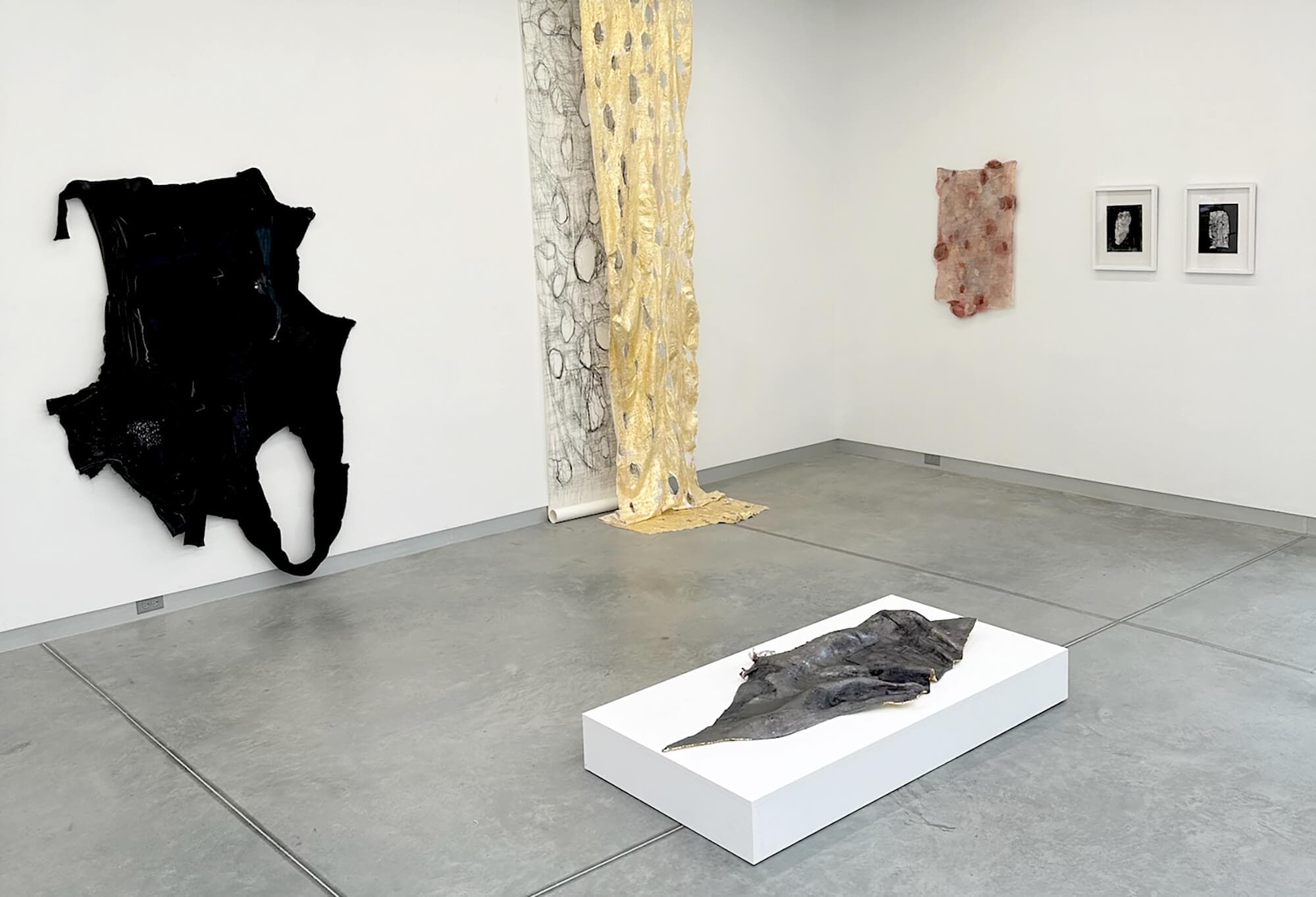 Both the opening reception and artists’ talk for Taleen Batalian and Françoise McAree’s joint exhibition were effervescent, echoing the textured surfaces of their sculptural works, which range in media from textile to print to plaster to golden encaustics. The conversational tensions between the two bodies of work are supported both in theme and spirit by the aptly named gallery. Overlap is a welcome addition to Rhode Island’s art scene, tucked away from the most densely touristy areas of Newport. It is an artist-run exhibition space founded by ceramicist Susan Matthews, co-directed with sculptor Alicia Renadette, and dedicated to supporting contemporary art, particularly “non-traditional artwork that is rigorous in craft and concept, yet accessible in presentation and context.” Batalian and McAree’s artworks are interspersed through the two rooms of the gallery, installed as alternating syllables in an unfolding prose poem full of internal rhyme and wordplay. A vitrine contains relics of both artists’ renderings of ears and hands, while elsewhere an intaglio print of feet hangs next to a sculptural lower leg propped against the wall. The curatorial choices of “Counterpoint” keep the viewer in motion, pausing to land on the connective tissue between the artists’ works.