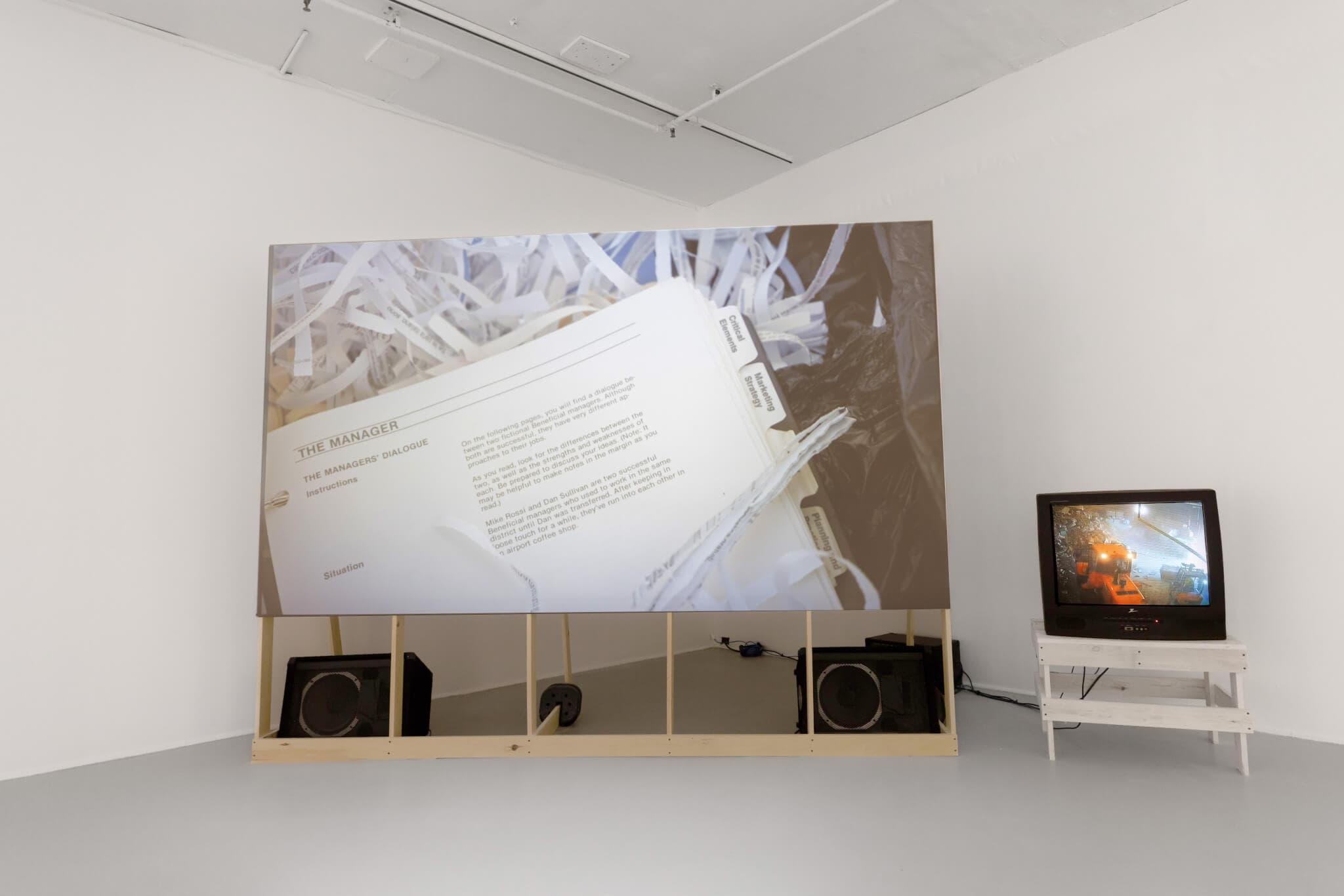 In the Mills Gallery at BCA, a two-channel video installation captures a peculiar outdoor scene: framed artwork is suspended in midair above a row of chairs; a towering pile of rubbish looms behind them. Isolate the foreground composition and you have the makings of a typical office waiting room. Yet these items, among others, were tossed on a curb by their original owners and, with special permissions, eventually collected and strategically arranged by artists Maia Chao and Fred Schmidt-Arenales.